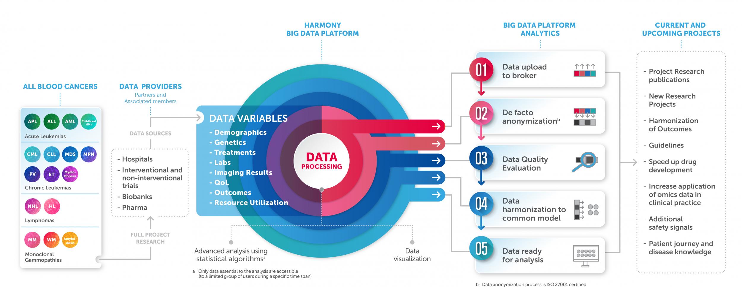 The HARMONY BigData Platform is a governed data lake powered by advanced Big Data analytics created to speed up hematology research. It is a best-practice-based data platform where data submitted from various sources – once harmonized and anonymized – create a cohesive data lake ready for scientific research. Beyond a robust technical infrastructure, the Platform offers a secure and trusted research environment compliant with data processing regulations and ethical guidelines. So that researchers can focus on research instead of administrative issues of working on data. By the end of 2023, approximately 165,000 patient datasets had been identified, fortifying algorithms in their quest for new knowledge. Check our Databarometer >.