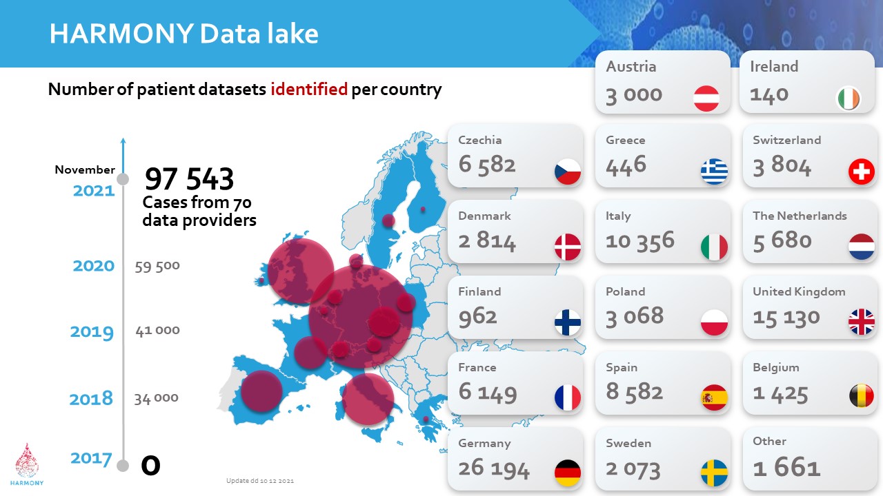 HARMONY researchers and data scientists work with a wide range of anonymized data such as demographic and medical history data, diagnosis data, omics data, treatment data, quality of life data and healthcare economic resources data.