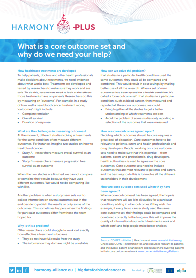 A COS is a minimum set of outcomes to be collected in future clinical trials which, ideally, have been agreed upon by all stakeholders. The COS is intended as an international standard to evaluate ALL treatments in clinical trials and other research settings (e.g., registry and observational studies). Using a COS will improve the comparability of clinical trials, enhance the consistency of reporting, and reduce selective reporting bias. The COS can also be incorporated into clinical guidelines and be used to improve patient management. This project aims to identify a COS for HL that will be accepted by all of HARMONY’s stakeholder groups.