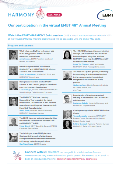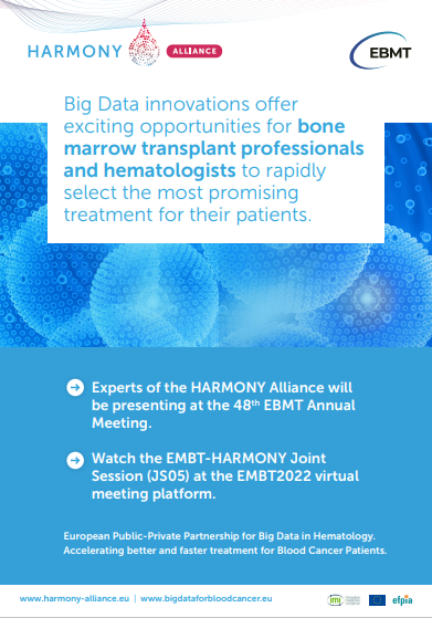 Learn about Big Data innovations and new ‘tools’ to rapidly select the most promising treatment for blood cancer patients. The EMBT-HARMONY joint session (JS05) is virtual and launched on March 19, at 09:50 at the virtual meeting platform. The EMBT2022 virtual meeting platform will be accessible until end of May 2022.