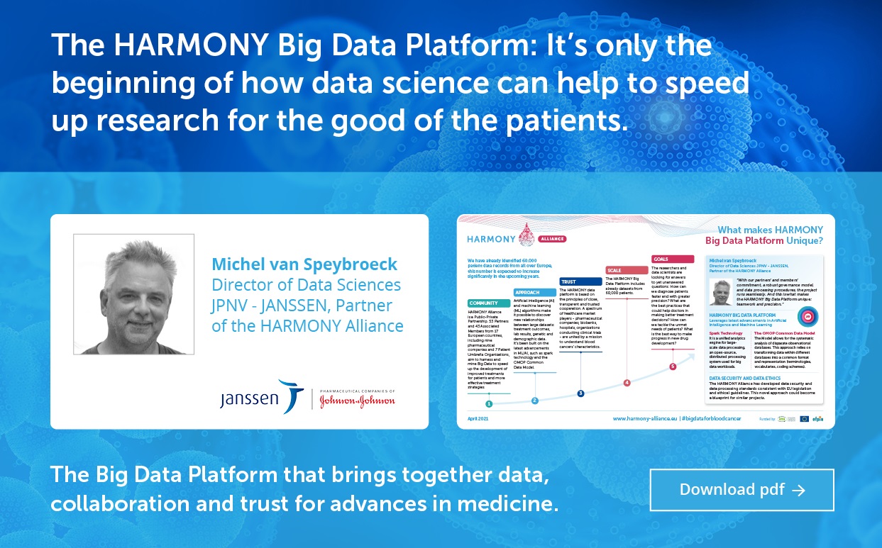 "We established a broad community, set robust data safety and privacy regulations, created a seamless governance model, developed novel methods of data analysis and harmonization, and we built a technical infrastructure. All that required and continues to require a very substantial coordinated effort between multiple stakeholders. But with the commitment of our Partners, Associated Member and Patient cluster, everything works as it should. And this is the unique feature of the HARMONY Big Data Platform: teamwork and precision," points out van Speybroeck. "Besides, let's not forget the scientific challenge – the HARMONY Alliance is oriented towards 14 blood cancers". The HARMONY researchers access various data streams from different sources to generate meaningful results for both patients and clinicians. Read about the HARMONY blood cancer focus >