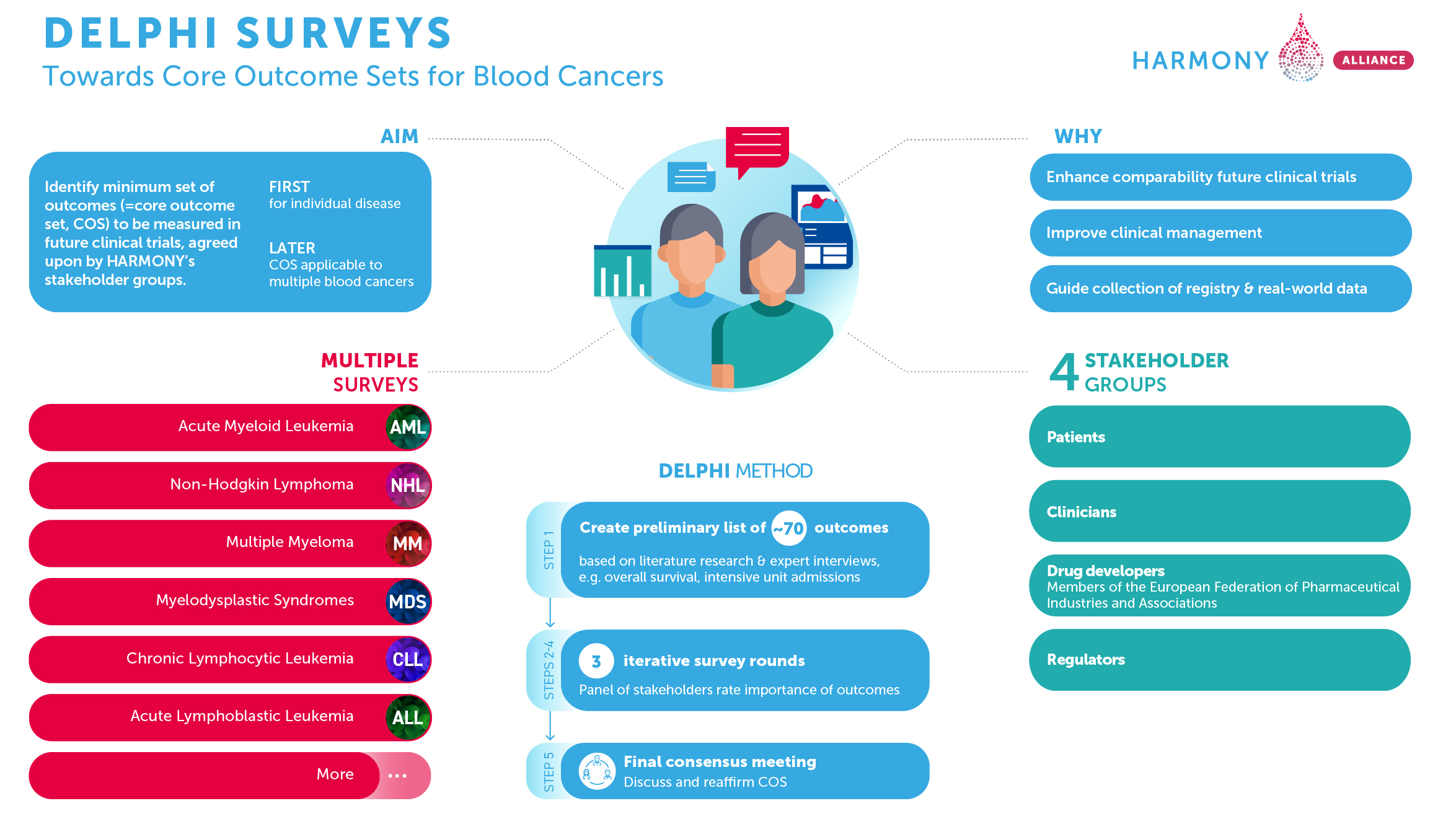 First, the core outcome sets of the individual diseases will be determined. Patients, clinicians, EFPIA members and regulators are invited to participate. Later, a core outcome set applicable to multiple blood cancers will be defined. This may assist researchers in selecting outcomes for future trials, thereby promoting harmonization of blood cancer studies and improving clinical management of the diseases.