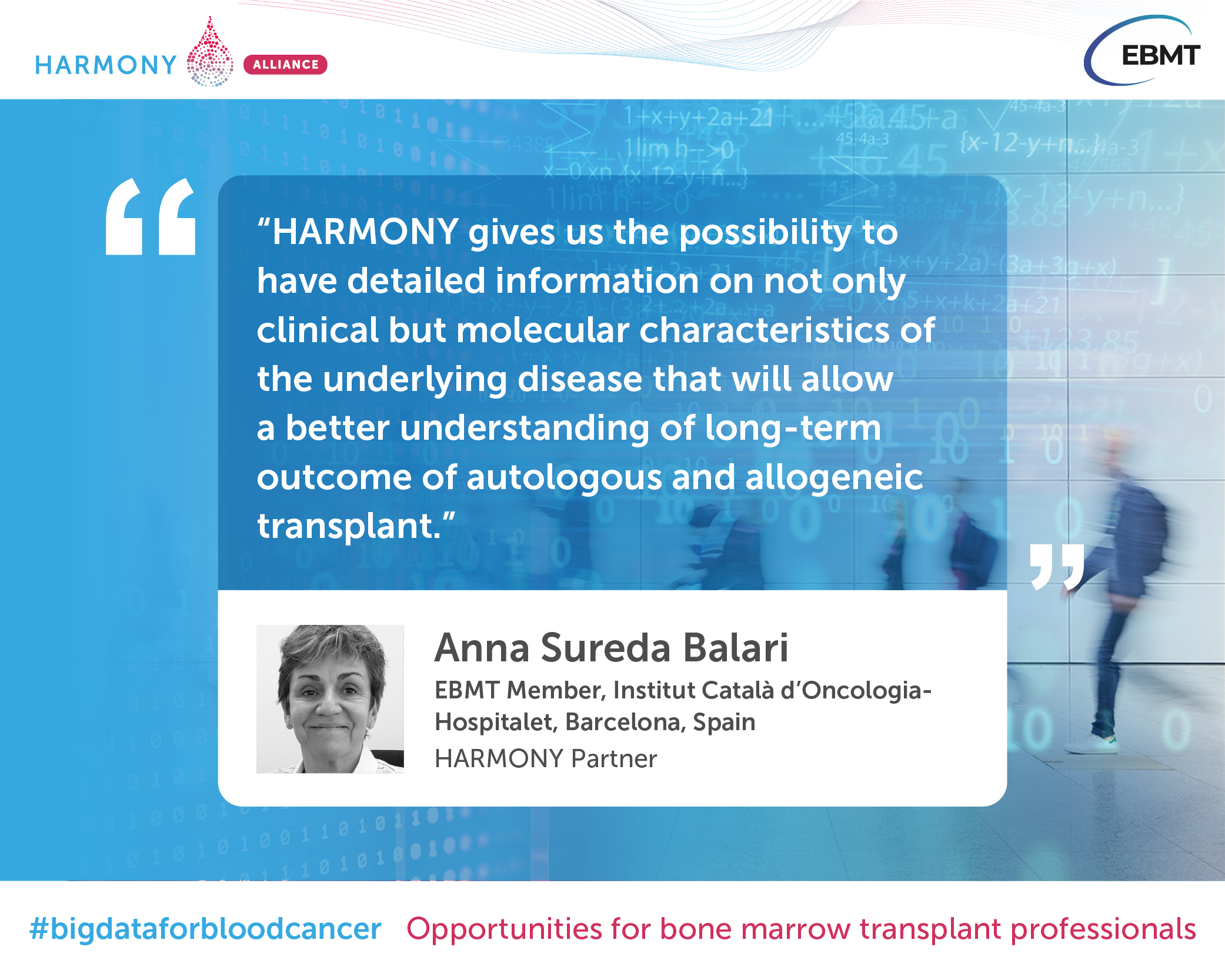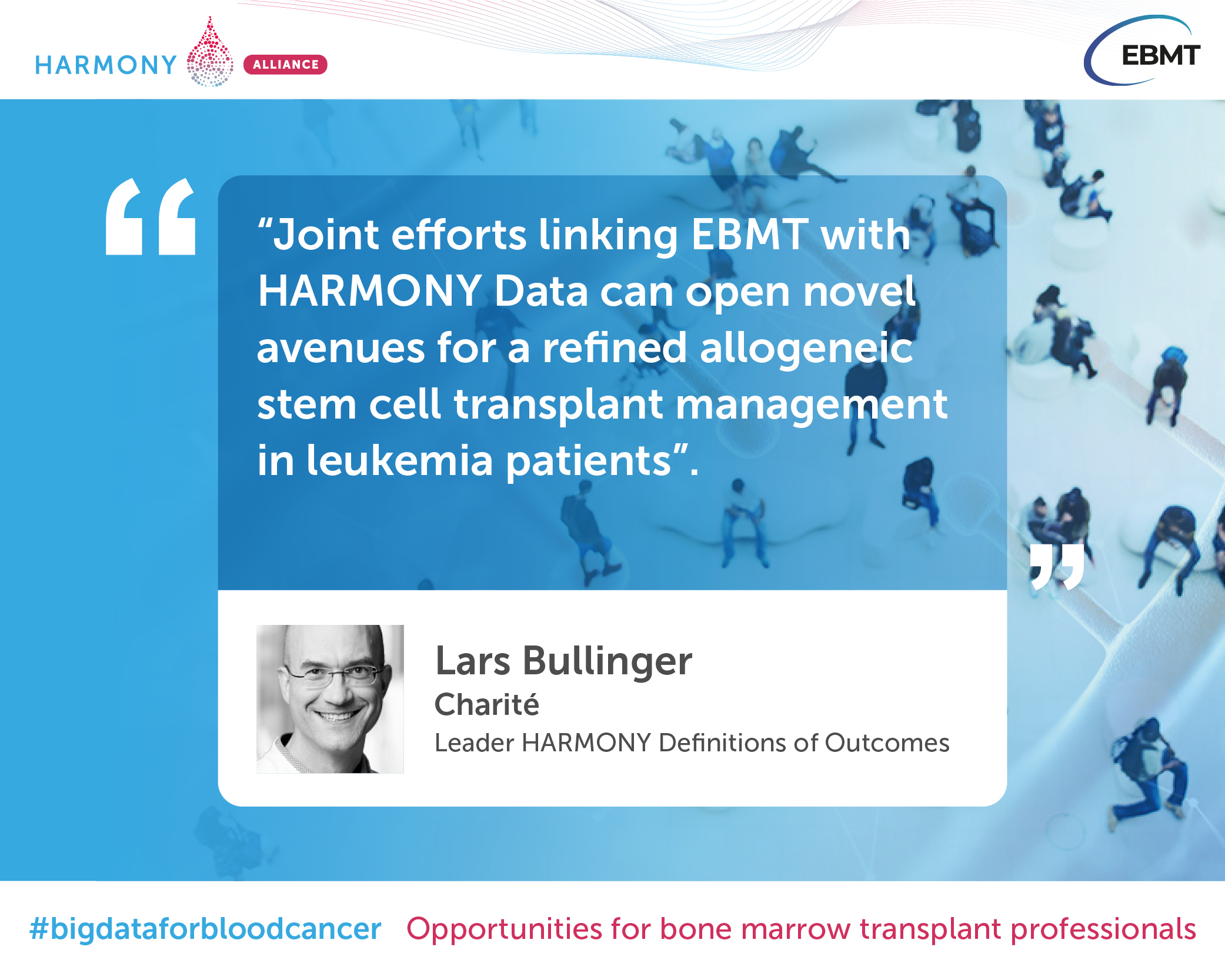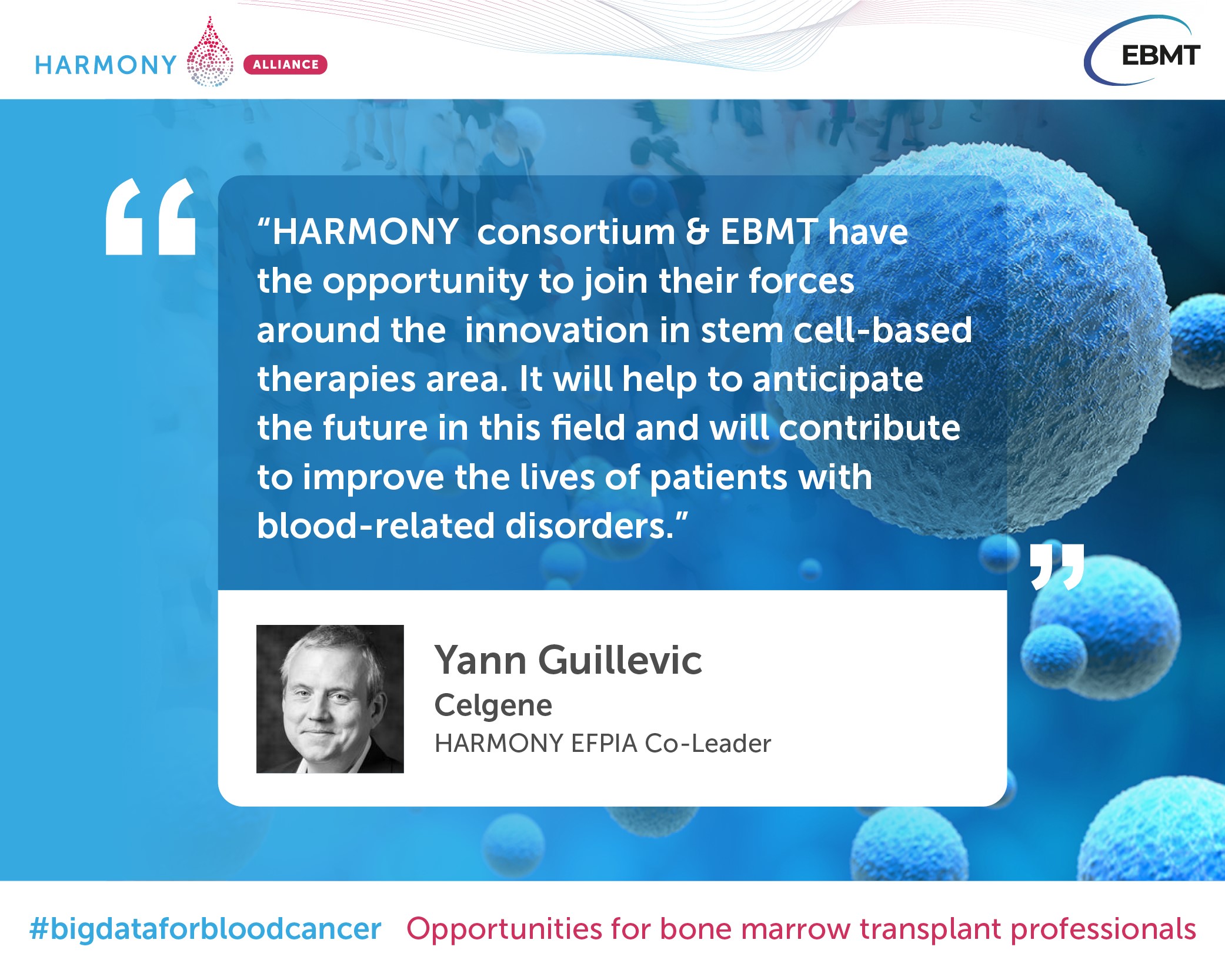 The HARMONY Alliance is a Public-Private Partnership including over 100 organizations such as European medical associations, hospitals, research institutes, patient organizations, pharmaceutical and IT companies. HARMONY uses Big Data analytics to accelerate the development of more effective treatments for blood cancer patients. HARMONY would like to inform bone marrow transplant professionals about the opportunities to become involved. Click here to open our special factsheet > | Connect with us to talk more >