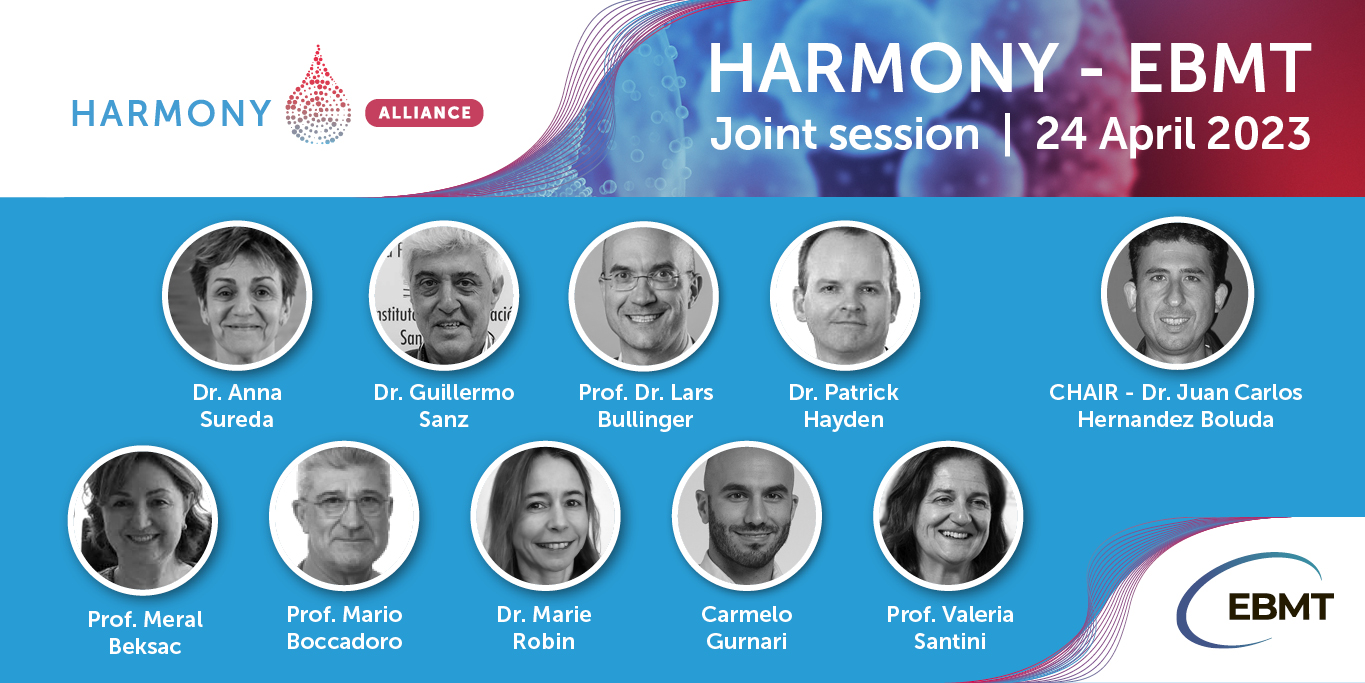 The European Society for Blood and Marrow Transplantation (EBMT) is a valued partner in the HARMONY Alliance. The 49th annual EBMT meeting will take place on 23-26 April 2023 in Paris. It will feature a HARMONY-EBMT joint session (JS01) on Monday 24 April 2023, 09:00 - 10:15. Join this special session, learn about Big Data innovations to rapidly select the most promising treatment for blood cancer patients and listen to the EBMT research proposals.