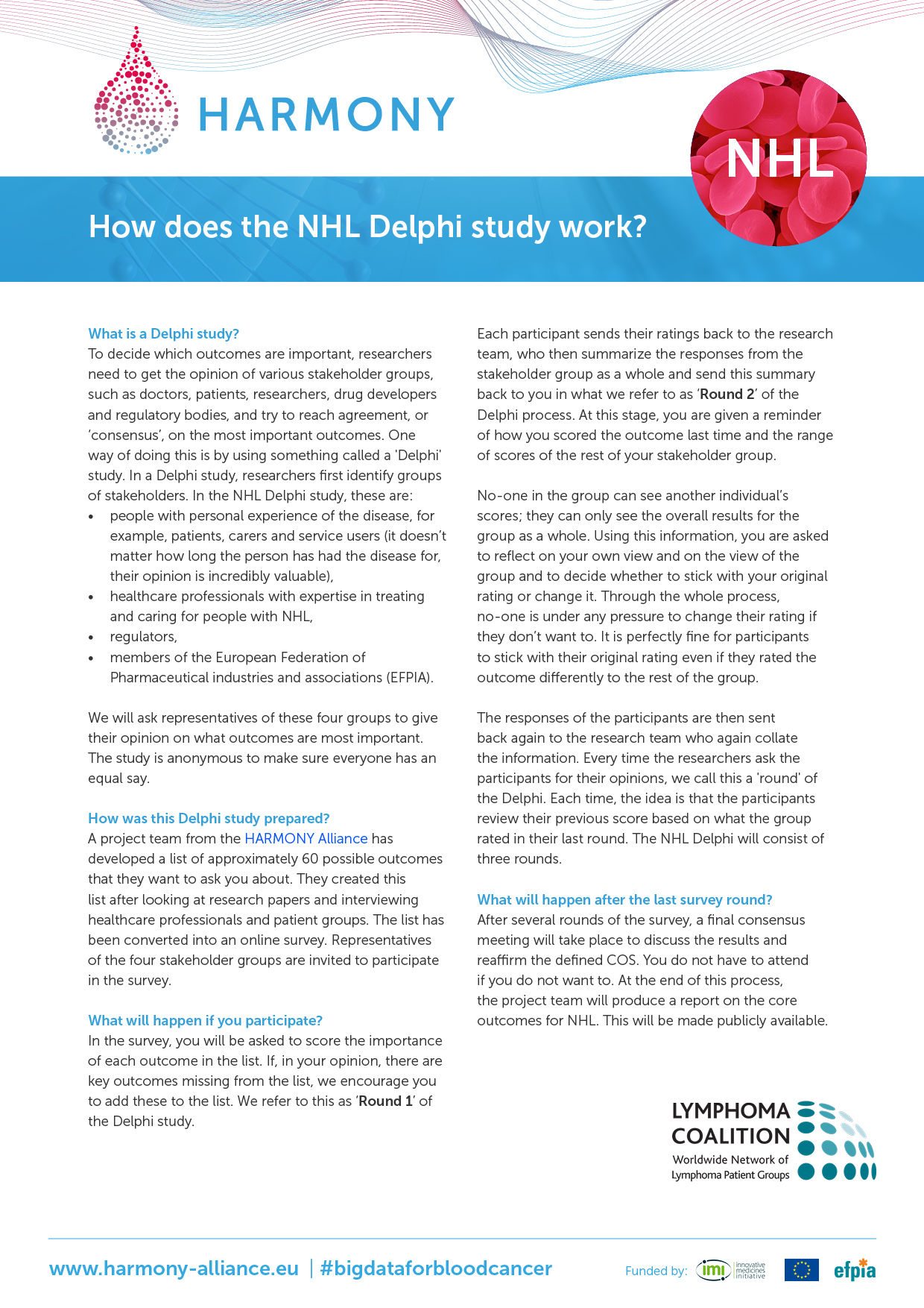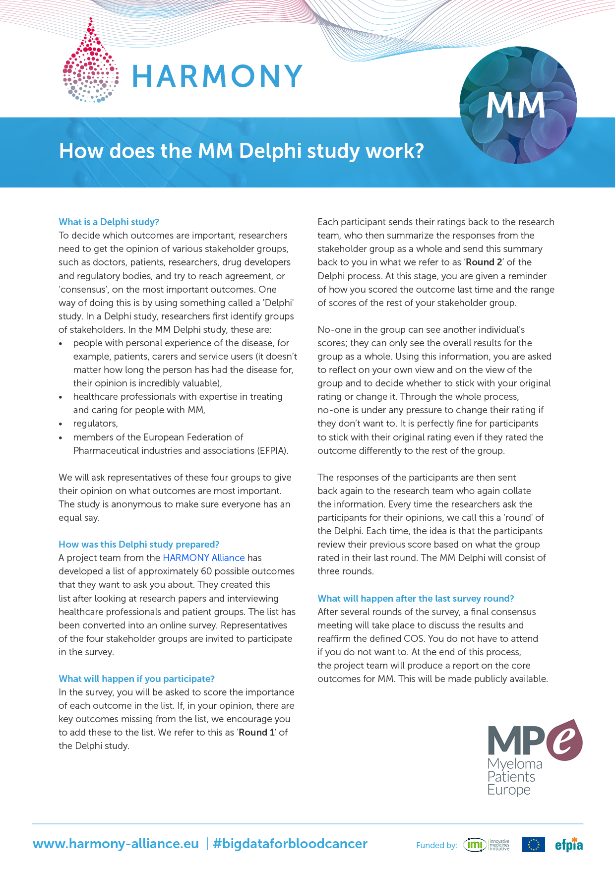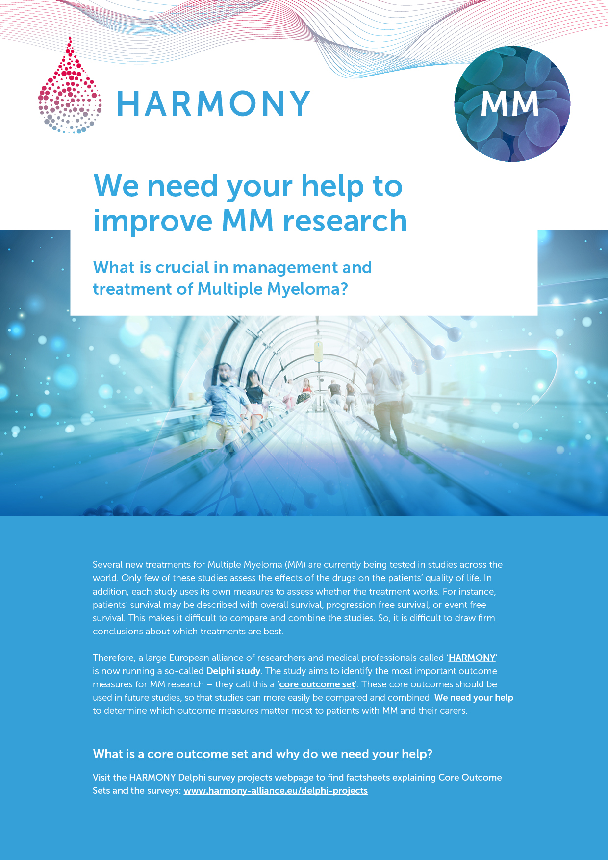 In close collaboration with the HARMONY Patient Cluster, special informative flyers have been developed to invite and inform patients to participate in the Delphi surveys. These flyers are available: